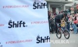 Atraksi sepeda BMX pada acara ngabuburit bareng bertajuk Ride and Fasting oleh Shift Pemuda Hijrah, di halaman Masjid Al Lathiif, Jl Saniten, Kota Bandung, Ahad (26/6). (Republika/Edi Yusuf)