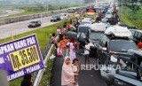 Pemudik berhamburan keluar dari kendaraan saat macet total di Tol Kanci-Pejagan, Jawa Tengah, Ahad (3/7). (Republika/Wihdan Hidayat)