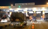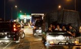 Pemudik menggunakan bak terbuka terjebak macet total di Tol Kanci-Pejagan, Jawa Tengah, Ahad (3/7).  (Republika/Wihdan Hidayat)