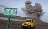 Mobil melintas di lautan pasir di kawasan Gunung Bromo, Probolinggo Jawa Timur, Selasa (12/7). (Antara/Ari Bowo Sucipto)
