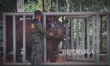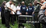 Direktur Jenderal Konservasi Sumber Daya Alam dan Ekosistem Kementerian Kehutanan Tachrir Fathoni (keempat kiri) menyerahkan hewan siamang untuk dilepasliarkan di Taman Nasional Way Kambas (TNWK), Lampung Timur, Rabu (27/7).Republika/Edwin Dwi Putranto (FOTO : Republika/Edwin Dwi Putranto)