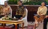 (dari kiri) Menko Prekonomian Darmin Nasution, Presiden Joko Widodo, dan Menteri Keuangan Sri Mulyani saat acara pengarahan Presiden kepada pejabat eselon I, II dan II Ditjen Pajak, Kementerian Keuangan di Istana Negara, Jakarta, Kamis (28/7). (Republika/W (FOTO : Republika/ Wihdan)
