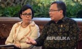 Menteri Keuangan Sri Mulyani berbincang dengan Kepala Bapenas Bambang Brodjonegoro di Istana Negara, Jakarta, Kamis (28/7). (Republika/Wihdan) (FOTO : Republika/ Wihdan)