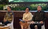 (dari kiri) Presiden Joko Widodo, Menteri Keuangan Sri Mulyani, dan Kepala Bapenas Bambang Brodjonegoro di Istana Negara, Jakarta, Kamis (28/7).(Republika/Wihdan) (FOTO : Republika/ Wihdan)