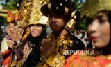 Sejumlah santri dengan menggunakan baju adat saat menyambut peserta pawai Ta’aruf yang menggunakan mobil hias di sepanjang Jalan Pejanggik, Kota Mataram, Nusa Tenggara Barat, Jumat (29/7). (Republika/Raisan Al Farisi) (FOTO : Republika/Raisan Al Farisi)