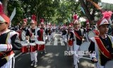 Siswa-siswi Kota Mataram menyambut peserta pawai Ta’aruf di sepanjang Jalan Pejanggik, Kota Mataram, Nusa Tenggara Barat, Jumat (29/7). (Republika/Raisan Al Farisi) (FOTO : Republika/Raisan Al Farisi)