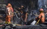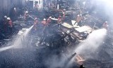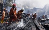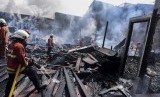 REPUBLIKA.CO.ID, JAKARTA -- Petugas pemadam kebakaran membersihkan puing-puing di lokasi kebakaran gudang dan tempat pembuatan mebel di kawasan Cipinang Muara, Senin (1/8).