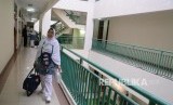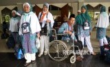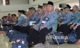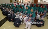 Sejumlah calon jamaah haji kloter 1 tiba di Asrama Haji Pondok Gede, Jakarta Timur, Senin (8/8). (FOTO : Republika/ Yasin Habibi)