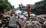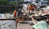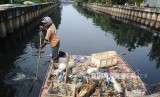 Petugas Unit Pengelola Kebersihan (UPK) Badan Air Dinas Kebersihan DKI sedang mengambil sampah di kali Pesing, Jakarta Barat, Jumat (12/8). (Republika/Tahta Aidilla) (FOTO : Republika/ Tahta Aidilla)