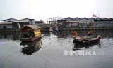 REPUBLIKA.CO.ID, Petugas Unit Pengelola Kebersihan (UPK) Badan Air Dinas Kebersihan DKI sedang mengambil sampah di Kali Jodo, Tambora, Jakarta Barat, Jumat (12\8). Tingkat kesadaran warga untuk tidak membuang sampah ke kali masih rendah, terlihat dari tumpukkan yang setiap hari selalu ada.