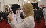 Anggota Pasukan Pengibar Bendera Pusaka (Paskibraka) Nasional 2016 asal Aceh Cut Aura Maghfirah dipeluk ibundanya seusai upacara pengukuhan yang dipimpin Presiden Joko Widodo di Istana Negara, Jakarta, Senin (15/8). (FOTO : Antara/ Yudhi Mahatma)