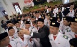 Menpora Imam Nachrawi (tengah) bersama Pasukan Pengibar Bendera Pusaka (Paskibraka) Nasional 2016 yang akan bertugas dalam upacara Peringatan Detik-Detik Proklamasi HUT ke-71 RI berswa foto seusai upacara pengukuhan di Istana Negara, Jakarta, Senin (15/8). (FOTO : Antara/ Yudhi Mahatma)