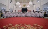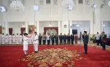 Presiden Joko Widodo (kanan) memimpin upacara Pengukuhan Pasukan Pengibar Bendera Pusaka (Paskibraka) Nasional 2016 yang akan bertugas dalam upacara Peringatan Detik-Detik Proklamasi HUT ke-71 RI di Istana Negara, Jakarta, Senin (15/8). (FOTO : Antara/ Yudhi Mahatma)