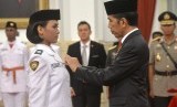 Presiden Joko Widodo (kanan) secara simbolis mengukuhkan Pasukan Pengibar Bendera Pusaka (Paskibraka) Nasional 2016 yang akan bertugas dalam upacara Peringatan Detik-Detik Proklamasi HUT ke-71 RI di Istana Negara, Jakarta, Senin (15/8). (FOTO : Antara/ Yudhi Mahatma)