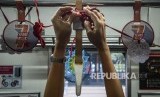Anggota komunitas Rajut Kejut menghias gerbong Commuter Line tujuan Jakarta Kota dengan kain rajut, Rabu (17/8) (FOTO : Raisan Alfarisi/Republika)