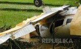 Bangkai pesawat latihan jenis Piper PA 28 jatuh di pesawahan di Karangnunggal Kabupaten Tasikmalaya, Kamis (19/8). (Foto: Fuji EP/Republika) (FOTO : Fuji EP/Republika )