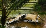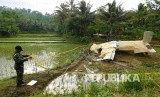 Bangkai Pesawat Piper PA28 di pesawahan Karangnunggal, Kabupaten Tasikmalaya. (FOTO : Fuji EP/Republika )