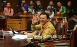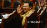 Gubernur DKI Jakarta Basuki Tjahaja Purnama atau Ahok melambaikan tangan ke arah wartawan saat mengikuti sidang perdana di Gedung Mahkamah Konstitusi (MK), Jakarta, Senin (22/8). (Republika/Raisan Al Farisi) (FOTO : Republika/Raisan Al Farisi)