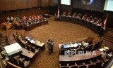 Ketua KPAI Asrorun Niam Sholeh memberikan keterangan di depan majelis hakim konstitusi pada sidang lanjutan judicial riview KUHP pasal 284, 285, dan 292 di Mahkamah Konstitusi, Jakarta, Selasa (23/8). (FOTO : Wihdan HIdayat/Republika)