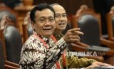 Pakar Hukum Tata Negara UI Hamid Chalid (dari kiri) bersama Pakar Hukum Unpad Atip Latipulhayat menghadiri sidang lanjutan judicial riview KUHP pasal 284, 285, dan 292 di Mahkamah Konstitusi, Jakarta, Selasa (23/8). (FOTO : Republika/ Wihdan)
