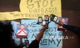 Jurnalis melakukan aksi solidaritas di depan Kantor Kementerian Koordinator Bidang Politik, Hukum dan Keamanan (Kemenko Polhukam) Jakarta, Kamis (25/8). (Republika/Rakhmawaty La'lang) (FOTO : Republika/Rakhmawaty La'lang)