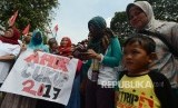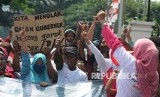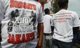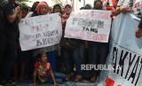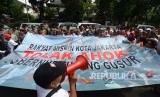 Kelompok yang mengatasnamakan rakyat miskin kota Jakarta melakukan aksi di depan Kantor Dewan Perwakilan Pusat PDI Perjuangan di Jalan Diponegoro, Jakarta Pusat, Kamis (25/8) (FOTO : Republika/ Raisan Al Farisi)