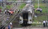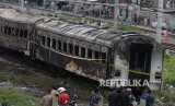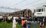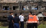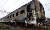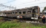 Dua gerbong kereta api (KA) Kertajaya jurusan Jakarta-Pasar Turi hangus terbakar di perlintasan Stasiun Tanjung Priok, Jakarta Utara, Kamis (25/8). (Republika/Yasin Habibi) (FOTO : Republika/ Yasin Habibi)