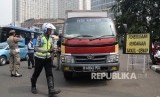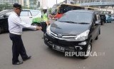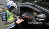 Petugas menilang pengendara mobil yang melanggar aturan pembatasan kendaraan sistem ganjil genap di MH Thamrin, Jakarta Pusat, Selasa (30/8). (Republika/Yasin Habibi) (FOTO : Republika/ Yasin Habibi)