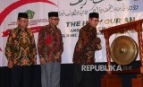 Menteri Agama Lukman Hakim Saifuddin (kanan) memukul gong sebagai tanda peresmian dibukanya International Conference on The Holy Qur’an dengan tema The Holy Qur’an and It’s Role in Building Islamic and Human Civilizations di Jakarta, Selasa (30/8). (FOTO : Republika/ Darmawan)