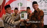Menteri Agama Lukman Hakim Saifuddin (kanan) menyerahkan Manual Book Kemenag Qur’an Kemenag versi android kepada Imam Besar Masjid Agung Palembang Hanawi Dencik (kiri) sebagai tanda peluncuran aplikasi Quran Kemenag, di Jakarta, Selasa (30/8). (FOTO : Republika/ Darmawan)
