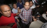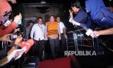 Bupati Banyuasin Yan Anton Ferdian (tengah) digiring petugas kepolisian saat keluar dari gedung Subarkah Direktorat Kriminal Khusus Polda Sumsel, Palembang, Sumatra Selatan, Minggu (4/9). (FOTO : Agung Supriyanto/Republika)