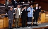 Wakil Ketua DPR Taufik Kurniawan (tengah) didampingi Wakil Ketua DPR Fahri Hamzah (kedua kanan) berfoto bersama Hakim Agung terpilih Ibrahim (kedua kiri), Panji Widagdo (kiri), dan Edi Riadi (kanan) dalam Rapat Paripurna di Kompleks Parlemen, Senayan, (FOTO : Republika/Rakhmawaty La'lang)