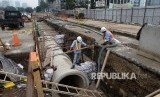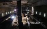 Pekerja beraktivitas di proyek pembangunan Mass Rapid Transit (MRT) di antara Stasiun Istora dan Stasiun Senayan, Jakarta, Kamis (8/9). (Republika/Yasin Habibi) (FOTO : Republika/ Yasin Habibi)
