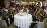 Dirut BTN Maryono, Dirut Bank Mandiri Kartika Wirjoatmodjo, Gubernur BI Agus Martowardojo, Menteri BUMN Rini Soemarno, Dirut BRI Asmawi Syam, Dirut BNI Achmad Baiquni dan Dirut Telkom Alex J Sinaga berbincang sebelum melaksanakan MoU sinergi pembentukan pe (FOTO : Republika/Prayogi)