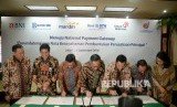 Gubernur BI Agus Martowardojo, Dirut Telkom Alex J Sinaga, Dirut BRI Asmawi Syam, Dirut Bank Mandiri Kartika Wirjoatmodjo, Dirut BNI Achmad Baiquni, Dirut BTN Maryono dan Menteri BUMN Rini Soemarno melakukan MoU sinergi pembentukan perusahaan prinsipal di (FOTO : Republika/Prayogi)