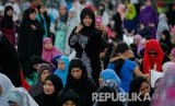 Seorang muslimah ber-swafoto setelah shalat Ied di Manila (FOTO : MARK R. CRISTINO/EPA)