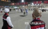 Petugas Panitia Penyelenggara Haji Indonesia bertugas di pintu keluar Jamarat menuju Makkah, untuk melayani jamaah yg membutuhkan bantuan. (Republika/ Amin Madani) (FOTO : Republika/ Amin Madani)