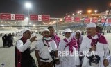 Petugas PPIH (kiri) membantu mengarahkan jamaah haji Indonesia rute kembali menuju hotel di Makkah usai melontar jumrah di Mina, Selasa (13/9) dini hari. (Republika/ Amin Madani) (FOTO : Republika/ Amin Madani)