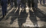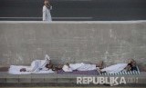 Beberapa orang jamaah haji beristirahat sementara lainnya tengah berjalan kaki menuju arah Jamarat. (FOTO : FAZRY ISMAIL/EPA)
