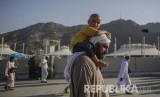Seorang jamaah haji cilik yang plontos digendong ayahnya menuju Jamarat untuk melempar Jumrah Aqabah. (FOTO : FAZRY ISMAIL/EPA)