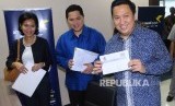 Presiden Direktur PT Adaro Energy Tbk (Adaro) Garibaldi Thohir, Presiden Direktur PT Mahaka Media Erick Thohir dan Pemegang saham Adaro Arini Subianto (dari kanan) menunjukan laporan data aset dan hartanya dalam program pengampunan pajak (tax amnesty) di K (FOTO : Republika/Agung Supriyanto)