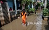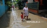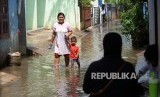 Warga berjalan melintasi genangan air saat banjir di permukiman warga di kawasan Cipinang Melayu, Jakarta Timur, Kamis (15/9). (FOTO : Republika/ Yasin Habibi)
