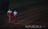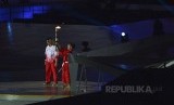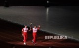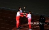Atlet Legenda Nasional Ade Rai (binaraga) dan Anton Suseno (tenis meja) membawa obor pada prosesi penyalaan Api PON di kaldron Pembukaan PON XIX 2016, Sabtu (17/9). (Foto: Rakhmawaty La'lang) (FOTO : Rakhmawaty La'lang/Republika)