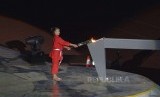 Karateka Lala Diah Pitaloka (kiri) menyulut api kaldron yang menandai pembukaan PON XIX 2016 Jawa Barat di Stadion Gelora Bandung Lautan Api, Bandung, Sabtu (17/9). (Foto: Akbar Nugroho Gumay) (FOTO : Akbar Nugroho Gumay/Antara)