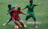 Pemain Sulsel Andri Faisal Amru (tengah) mencoba melepaskan hadangan pemain Kal Sel dalam pertandingan Grup B di Stadion Patriot Chandrabaga, Bekasi,Jawa Barat, Ahad (18/9). (Republika/ Tahta Aidilla) (FOTO : Republika/ Tahta Aidilla)