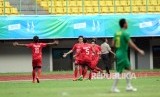 Pemain Sulsel melakukan selebrasi usai mencetak gol ke gawang Kal Sel dalam pertandingan Grup B,stadion Patriot Chandrabaga, Bekasi, Jawa Barat, Ahad (18/9). (Republika/ Tahta Aidilla) (FOTO : Republika/ Tahta Aidilla)