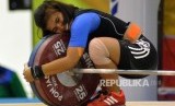 Lifter putri Jabar Sri Wahyuni Agustani memeluk beban usai bertanding pada kelas 48 kg di GOR Sabilulungan Jalak Haruat,Kabupaten Bandung, Jabar,Selasa (20/9) (FOTO : Republika/Prayogi)