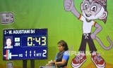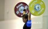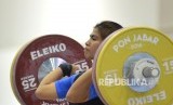 Lifter putri Jabar Sri Wahyuni Agustani mengangkat barbel saat bertanding pada kelas 48 kg di GOR Sabilulungan Jalak Haruat,Kabupaten Bandung, Jabar,Selasa (20/9). (FOTO : Republika/Prayogi)