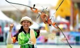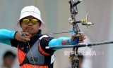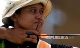 Pemanah putri Jatim Ika Yuliana usai membidik sasaran pada final nomor Recurve individu putri PON XIX di Lapangan Panahan Kompleks Si Jalak Harupat, Kabupaten Bandung, Jabar, Rabu (21/9). (FOTO : Republika/Prayogi)