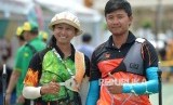 Pemanah putri Jatim Ika Yuliana dan Pemanah putra Jatim Riau Ega Agata berfoto usai bertanding final nomor Recurve individu putra dan putri PON XIX di Lapangan Panahan Kompleks Si Jalak Harupat, Kabupaten Bandung, Jabar, Rabu (21/9). (FOTO : Republika/Prayogi)